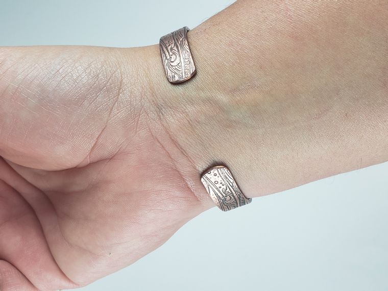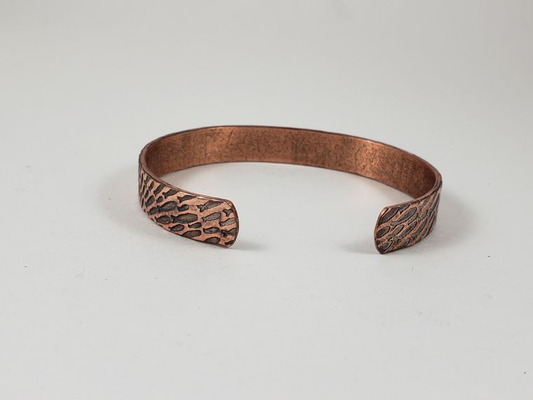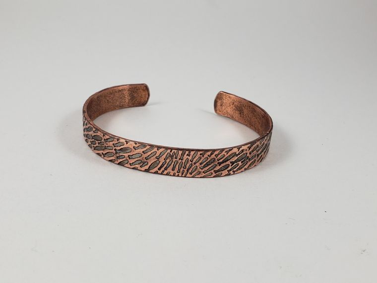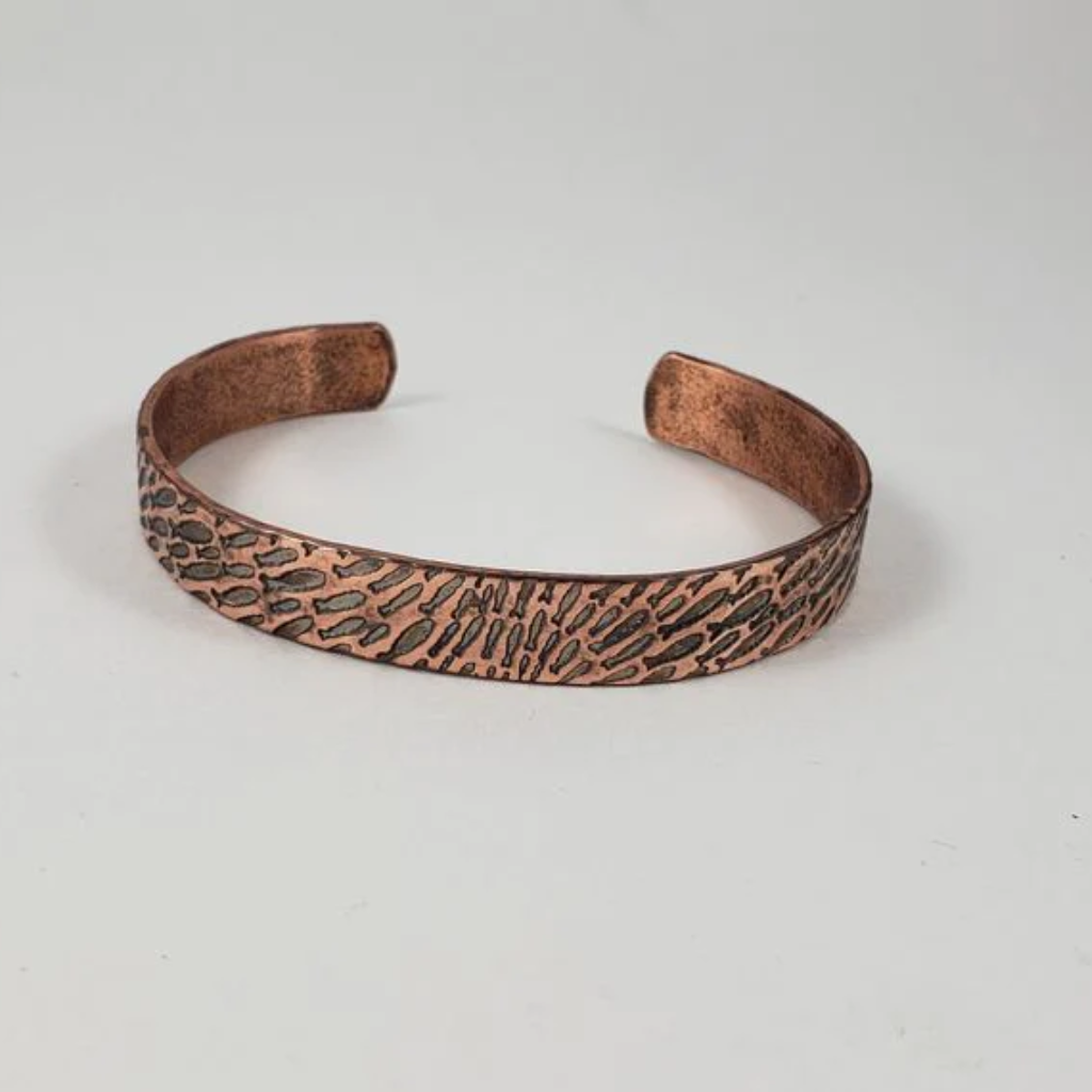 Copper fish cuff bracelet. This copper fish cuff bracelet was hand textured in my home studio. It measures 5-3/4" x 3/8" (approx.). It is slightly adjustable. Each bracelet is made-to-order and will vary from piece to piece. It is made from raw copper and sealed with Renaissance Wax to slow oxidation.