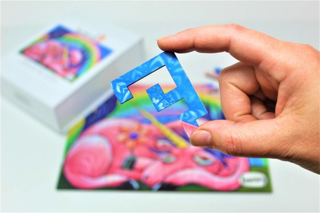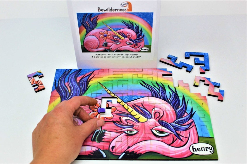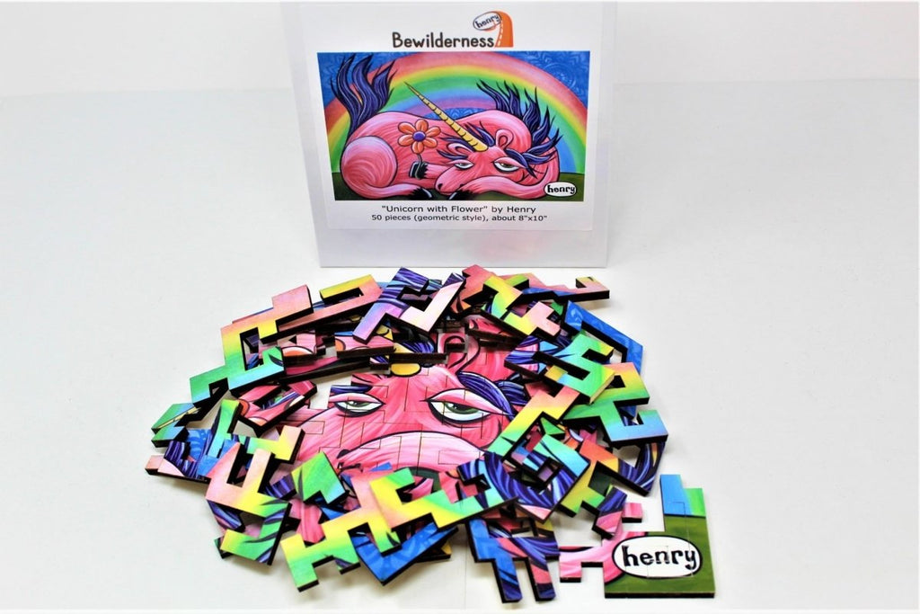 This wooden jigsaw puzzle is cut with our very own geometric piece design featuring a melancholy unicorn holding a flower, by Seattle's own artist: Henry. It's laser cut from high-quality 3/16" birch and basswood ply. This design is 50 pieces, but probably more challenging than many other 50-piece puzzles you may have experience with! With the straight-edge geometric cuts, you can't just start with the border and work your way in.